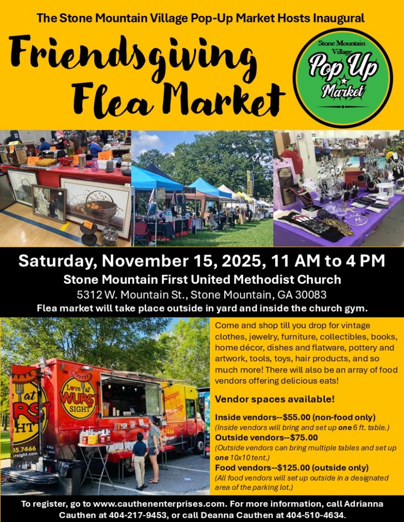 The Stone Mountain Village Pop-Up Market is FREE to the public. For a free ticket, visit https://friendsgivingflea.eventbrite.com